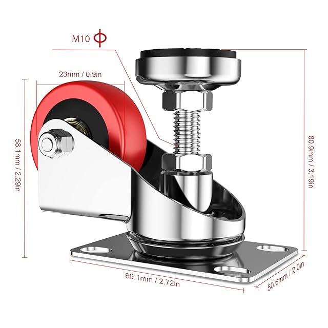 プレートサイズ:69.1*50.6mm(長さx 幅) 車輪幅:0.9インチ/23.1mm 車輪径:2インチ(50.8mm) 取付高:80.9mm 耐荷重(車輪):500KG 耐荷重(アジャスターフット):680KG