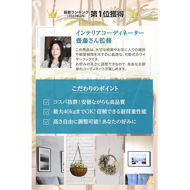 【製品性能】長さ0.5m~1.5mのステンレス製ワイヤーは、優れた防錆性と耐久性を備えており、使用荷重は約40kgです。