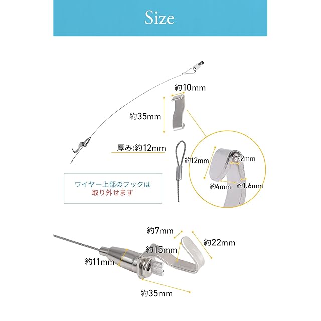 【製品概要】 絵画やハンドメイド作品の展示に欠かせないフック付きのワイヤーです。ピクチャーレールなどに額縁や絵画を簡単に吊り下げることができます。