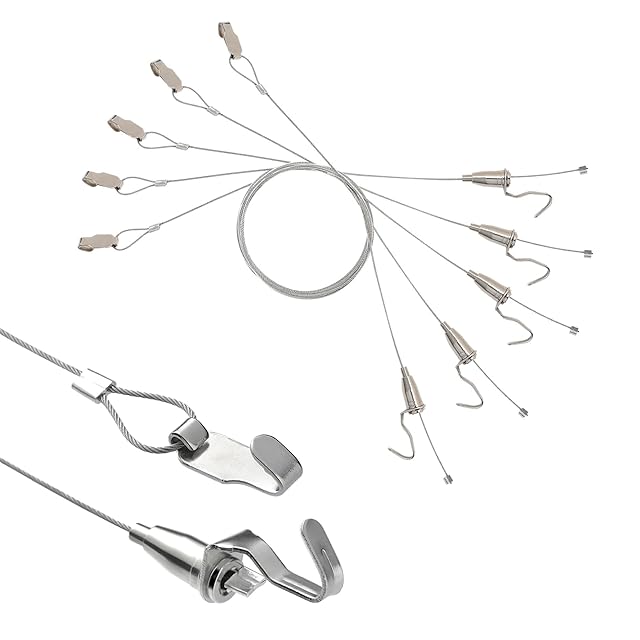 【使用方法】使用方法は非常にシンプルで、ワイヤーの上部レールフックなどにを引っかけ、ピクチャーフックを額縁の裏に引っ掛けるだけです。