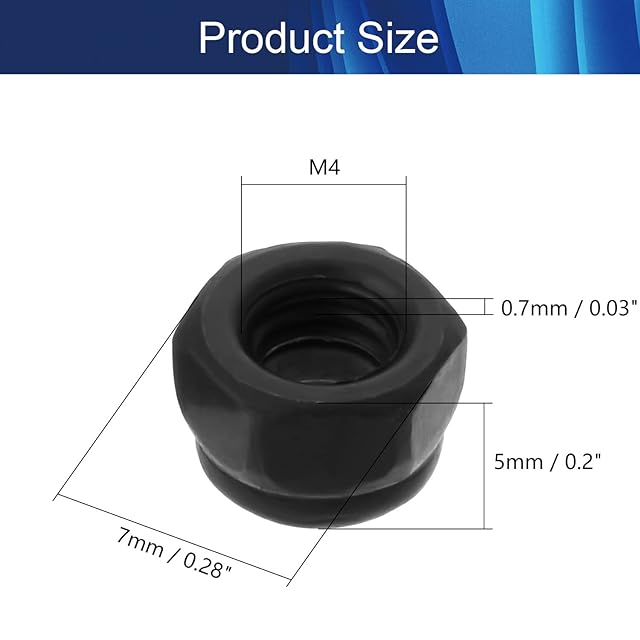 【スレッドサイズ】:M4;厚さ:5mm;対辺 (S):7mm;ねじ山のピッチ:0.7mm。
