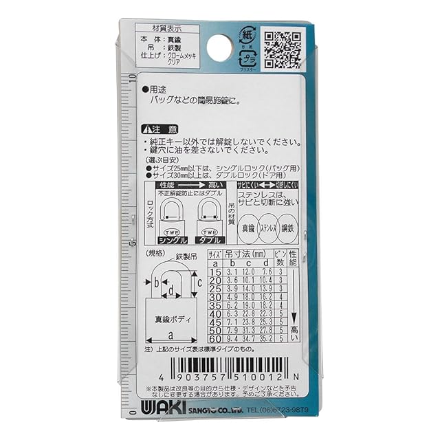 和気産業(Waki Sangyo) TWE シリンダー錠 南京錠 バック 防犯 管理 本体1個 キー3本 15mm VAー001