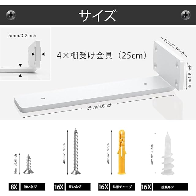 【バッケージュ内容】:棚ブラケット4個セットおります。サイズはハンドル長さ25cm、幅4cm、厚さは約5mm;取り付け面:8*4cmです;付属のネジ、アンカーが付いておりますので、届いたらすぐに作業が出来ます。