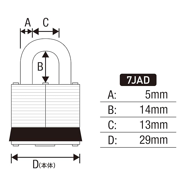 サイズ:(本体)幅29mm(シャックル)太さ5mm、内径幅13×高さ14mm