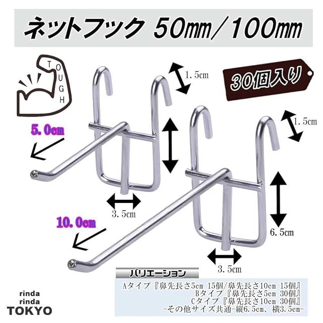 rinda ネットフック ワイヤーネット メッシュパネル 【 30個セット 50㎜ 100㎜ 】 網 有孔ボード 壁 店舗 展示 ディスプレイ (Cタイプ『鼻先長さ10cm 30個』)