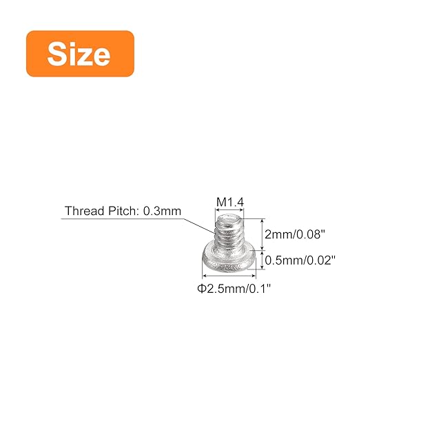 [フラットラウンドヘッドネジ] - ねじ溝タイプ: ; 仕上げ: 酸洗パッシベーション; ねじピッチ: 0.3 mm; ねじサイズ: M1.4x2 mm; ヘッド径: 2.5 mm; ヘッド高さ: 0.5 mm; パッケージ内容: 50個 x 機械ねじ。ネジサイズをご確認の上ご購入ください。