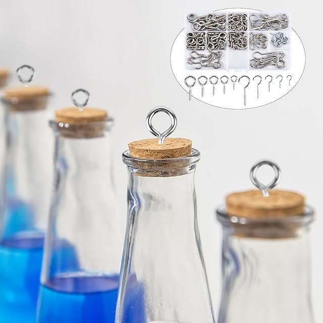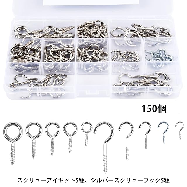 【パッケージ内容】:パッケージには2種類、10種類のサイズ、95個のアイネジと55個のネジフック、合計150個が含まれています。パッケージには保管用の透明なプラスチックボックスが付属しており、保管に便利で、サイズの混合を防ぎます。