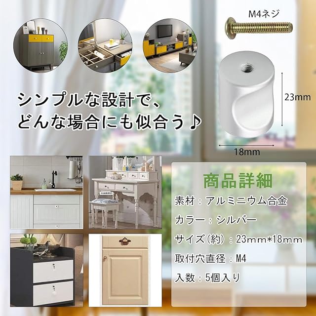 商品名:Aicosineg 取っ手 5個入り アルミ合金 つまみ 箪笥 家具取っ手 ノブ 引き出し取手 引き出し キャビネット 食器棚 ドア ハンドル ワードローブ ネジ付き シルバー 直径18mm 高さ23mm