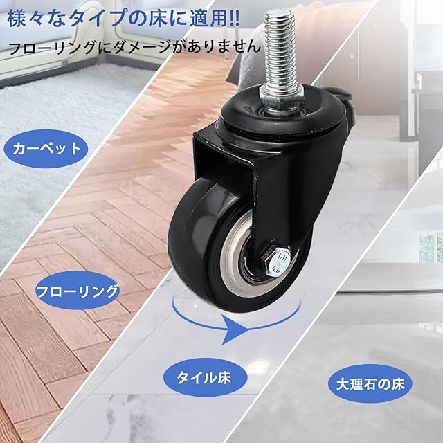 【高品質キャスター】高品質のPU素材、金属で作られています。軽量で耐久性があり、耐摩耗性、耐衝撃性に優れ、床を傷つけることなくスムーズに動きます。木製の床、スレート、ラミネート、タイル、カーペット、コンクリート、フローリングおよび他のすべての床に適応されます。
