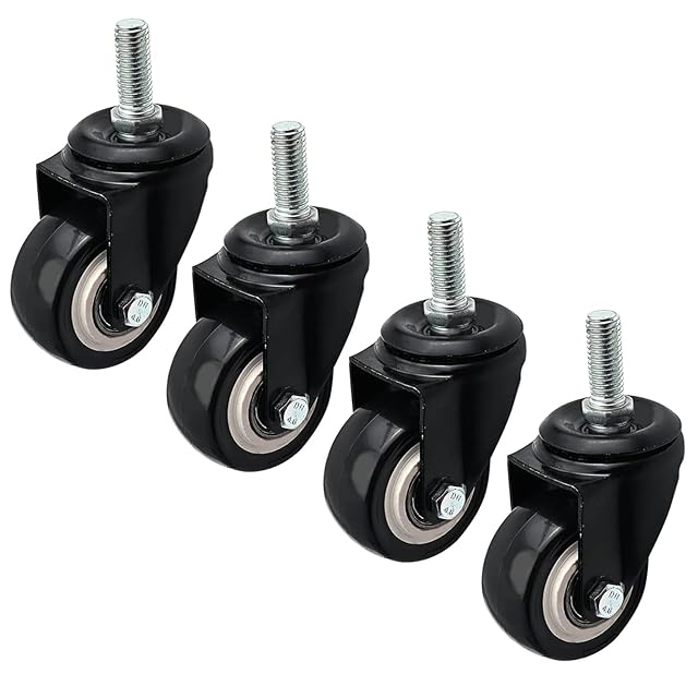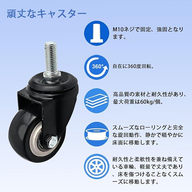 【商品仕様】<br><br> ホイール経約50㎜<br><br> 車輪の幅約25㎜<br><br> ネジ径約10㎜(M10)<br><br> ネジの長さ約25㎜<br><br> ネジのピッチ1.5mm<br><br> 車輪の高さ約72mm<br><br> 耐荷重60kg/個<br><br> パッケージ内容:キャスター4個セット<br><br> テーブル、椅子、ソファ、棚などの家具、オフィスチェア、フライトケース、ショッピングカート、道具箱、ライトマシナリー、スピーカー、キャビネット、スタンド、小型産業機器など幅広くお使いいただけます。