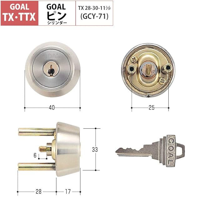 GOAL(ゴール) ピンシリンダー TXタイプ GCY-71 キー標準3本付属 玄関 鍵 交換 取替え テール刻印28 /扉厚28~30mm向け GCY71 TX /TDDシルバー色