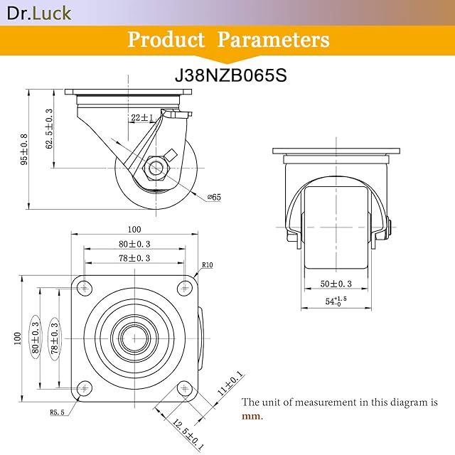 【商品サイズ】:車輪幅:50mm ; 車輪直径:65mm (2.5インチ); 一番上のプレート・サイズ:100*100mm; 高さ:95mm; 4個組自在車; 総許容荷重2000kg