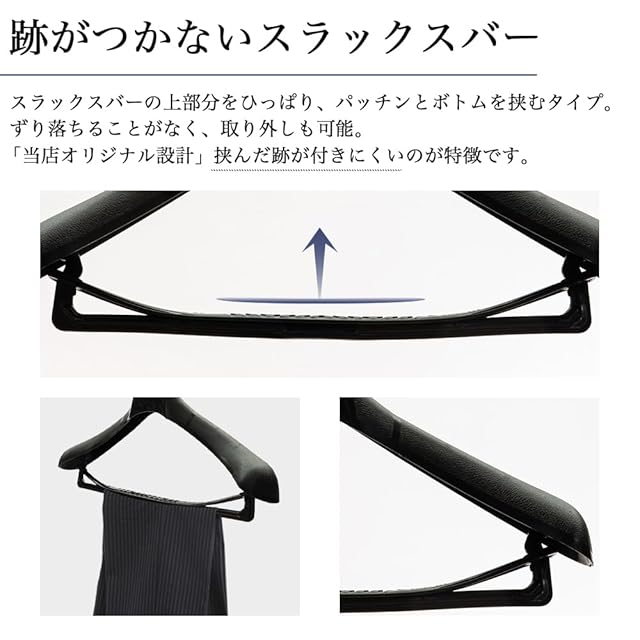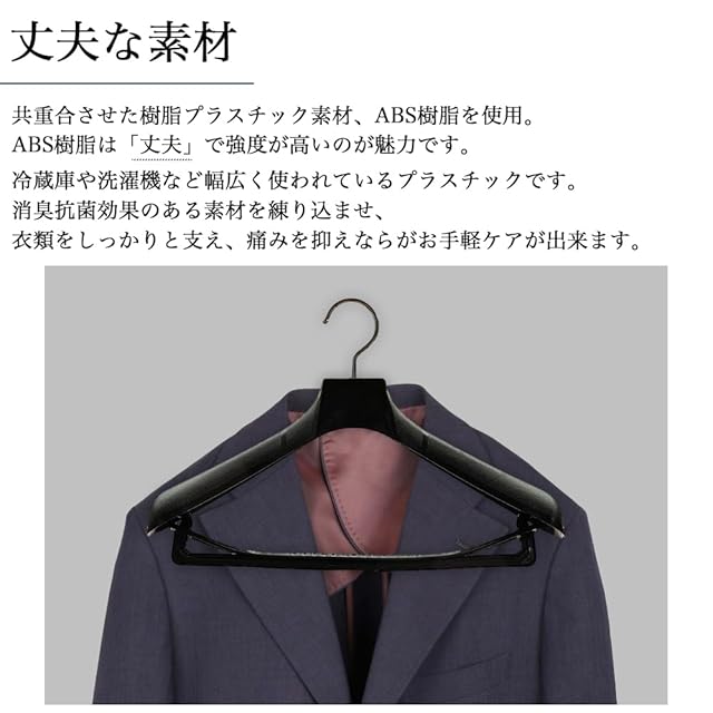 【商品特徴】ABS樹脂素材を使用し消臭抗菌効果のある素材の【練り込み】をほどこした高機能なスーツハンガーです。ハンガーにかけておくだけでお手軽ケア。スーツ・ジャケット等型崩れすることなくスッキリおさまるように設計しました。スラックス止めが付いている物はたくさんあると思いますが、スラックスをきつくプレスすることなく、落ちることなく、程よくパッチンしてくれます。厚みもほどよく、しっかりあり、型くずれしません。