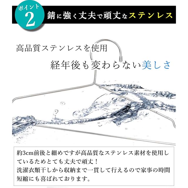お好きなサイズをお選びいただけます。30cm/32cm/35cm/40cm/42cm/45cm/50cmがございます。ご家族の衣類ハンガーや洗濯ハンガーにいかがですか。統一して使う事でインテリアとしてもおすすめです。業務用として会社様やサロン様、アパレルショップ様などにお使いいただいております。 フック部分には透明のキャップがついていて洋服へのダメージを防ぎ、ハンガーの両肩には凹みがございますのでワンピースなどのズレ落ちる衣類を掛けることができます。雨にぬれても錆びにくく・劣化もしにくいので長く愛用していただけます。