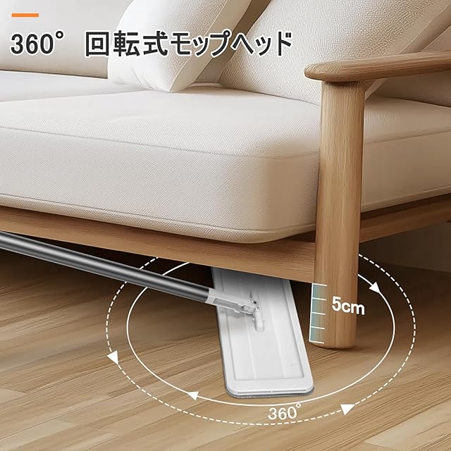 【360°回転モップ】:360度自由回転式ヘッド、わずか5CMの超薄タイプ。狭いスペースも、手が届きづらい家具の下やフローリングの端でもモップが入り込んでゴミやホコリをキャッチします。隅々まで綺麗に、角や階段などにもピッタリ。