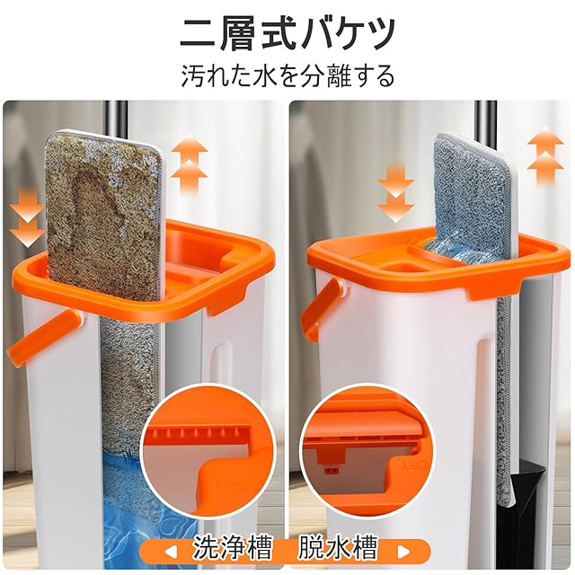 【汚水分離・手洗い不要】:立ったまま(腰曲げず)フロアモップを数回上下するだけで、簡単に水切り&汚れ落としできます。汚水分離のデザインで汚水と清水を分けて集めるから、水滴が飛び散りにくいし、もっときれいにモップを洗浄できます。