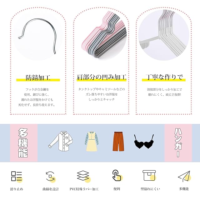 【高品質】高品質素材:合金鋼+PVC加工 サイズ:40cmx20cmx0.3cm、1本/約40g 。フック部分は防錆加工、つなぎ目は特殊加工しているので耐久性と安全性がとても良いハンガーです。PVC加工で滑りにくいのに加えて、両肩部分にへこみがあってキャミソールなどもさらに落ちにくい仕様です。