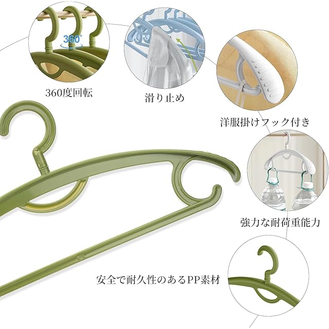 洗濯ハンガー 10本組 ハンガー かたくずれ防止 衣類用 360度回転フック おしゃれ すべらない 型崩れ防止 頑丈 跡がつかないハンガー 滑らないハンガー 乾湿両用 (グリーン)