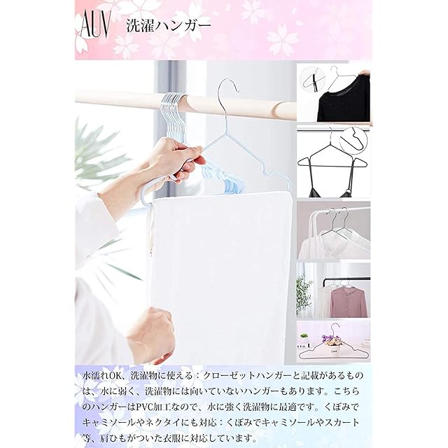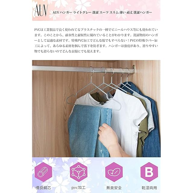 【滑らなくて強い】このハンガーは特殊PVC加工で、どんな衣類もしっかり止まるから、滑り落ちる心配はありません。AUVのハンガーは強度があり、滑りやすい物でも滑らないのでどんな衣服にでも使えます。強度があるのでプラスチックでは心配なコート類にも適しています。滑りやすいナイロン素材のジャージ等もがっちりつかんで滑らせません。