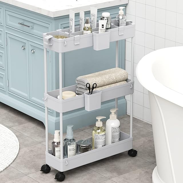 SPACEKEEPER キッチンワゴン 隙間収納 スリム 13cm 収納カップ 仕切板付き 多機能 小物 食品 調味料 キャスター付き 組立簡単 浴室 台所 冷蔵庫横 3段 グレイ