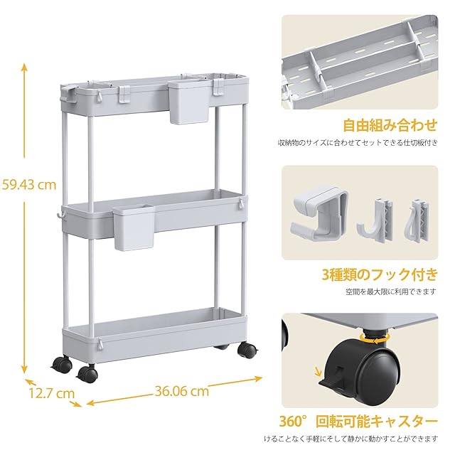 【どんな場面でも活躍】高級な材質は採用なので、高い安定性を誇ります。スリムボディーをして、部屋の隙間に自在に配置されています。トイレ収納、ベッドルーム、居間、子供部屋、キッチン、書店、美容室などの使用に最適して、収納力は抜群です。いろんなシーンで大活躍なキッチンワゴンです。