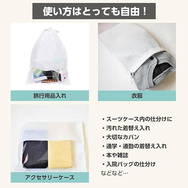 使い方:旅行に出かけるときのくつやサンダル、衣類(シャツ、肌着、靴下ほか)、タオル、小物、アクセサリーケースを入れる小分け 袋に。また、プレゼント用の袋などに。家族旅行、修学旅行、ビジネスでの出張の際の保管袋、収納袋、ノートや本をまとめて持ち運ぶ袋として。お子様とお出かけの際の汚れた靴、服、きれいな着替え入れなど汚れものを分けて収納したい方におすすめ。