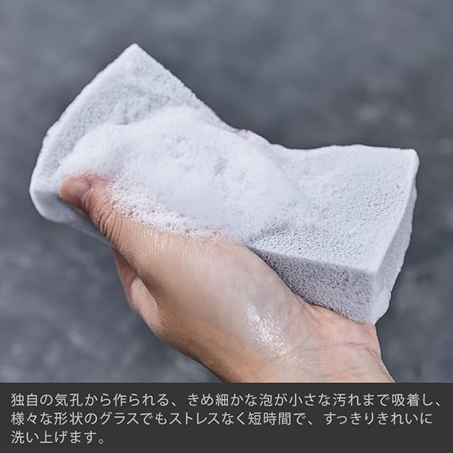 1)日本の技術力で実現した驚異の洗浄力 スポンジ表面の大小無数の気孔が生む、きめ細やかな泡が汚れを素早く吸着。 細長いフルートグラスや繊細なアンティークグラスなど、どんな形でも滑らかな泡が隅々まで届き、ストレスなく短時間ですっきり洗い上げます。