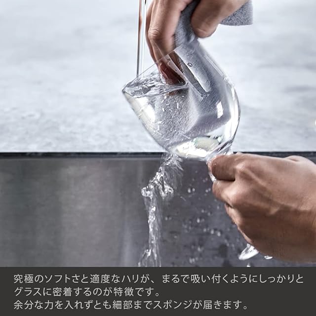 2)ソフトな触感と適度な弾力 余分な力を加えずとも、まるで自分の手のように、グラスの細部まで優しくフィットし、隅々まで汚れをキャッチ。 手にした瞬間にわかる、ほどよい弾力も魅力のスポンジで、上質な洗い心地がいつまでも持続します。