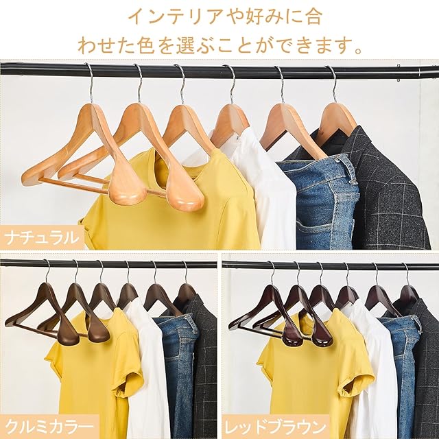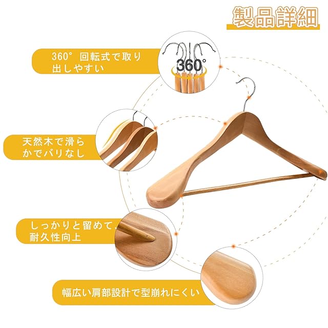 夢の家木製ハンガーセット バー付き 洋服 スーツ コート用ハンガー スーツハンガー 360度回転 クローゼット