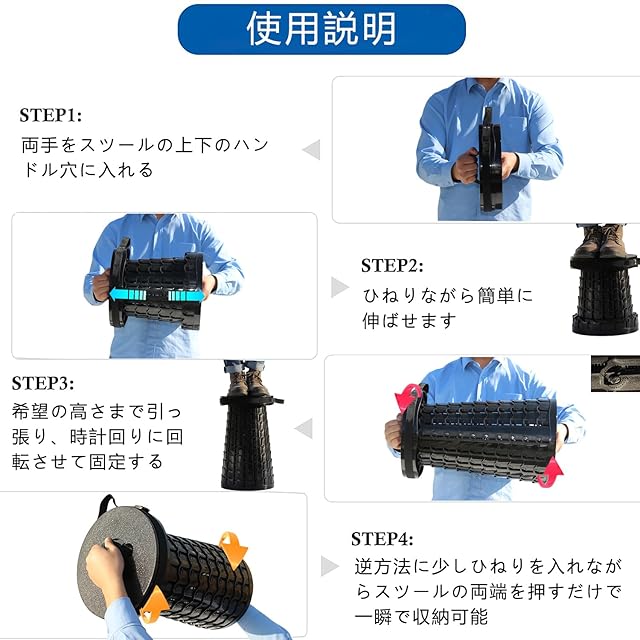 【使い方簡単】少しひねりを入れながら両端を引くだけでスツールが完成します。逆方向に少しひねりを入れながら両端を押すだけで収納できます。面倒な組み立てがなく、サッと出してすぐに使用いただける、キャンプや釣り、観戦で簡単に椅子が用意できます。防水性あり水に濡れても汚れても丸洗いしていただけます。