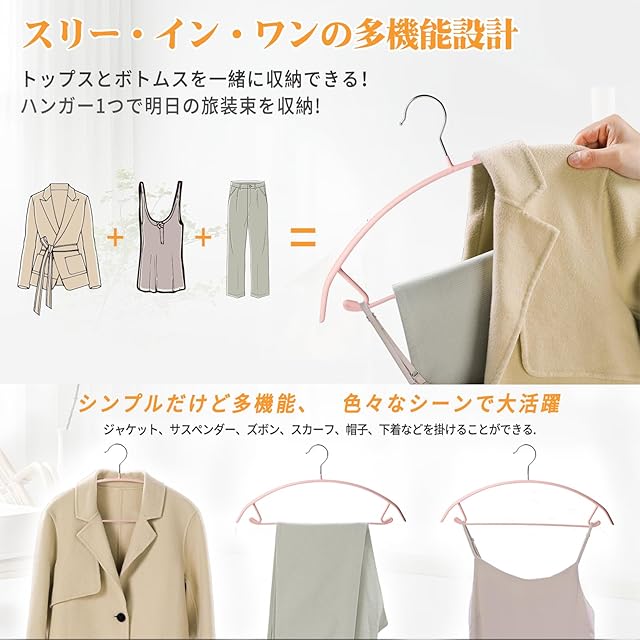 【多機能】ハンガーの下にある特別なバーデザインは、ネクタイを含むスーツ全体を完璧に収納できます。 ハンガーフックの部分は、合金鋼が使われているのでサビにくく、横掛け・縦掛けの両方に対応できます、方向を気にすることなく使えて便利です。ハンガーフックの下には小さな連結用フックが付いているため、ジャケットとスカートを重ねて1着分のスペースで収納できます。クローゼット等の収納スペースを最大限に活用することができます!!