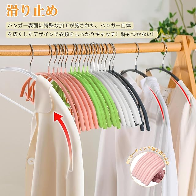 【PVCコーティング】ハンガーはフックを除いて全体的にPVCコーティングされています。 これにより、摩擦力が大幅に増加し、滑り抵抗が向上します。洗濯ハンガーの滑らない加工は肩部分と下側に3箇所だけです。衣類の取り外しがしにくく使いにくいと感じることがないんです、簡単に取り外しができます。ハンガーは肩ヒモやスカートのウエストヒモが引っかけられる小さなフックが付いているのもポイントです。キャミソールなどの肩紐タイプの衣類にも便利にご使用いただけます。