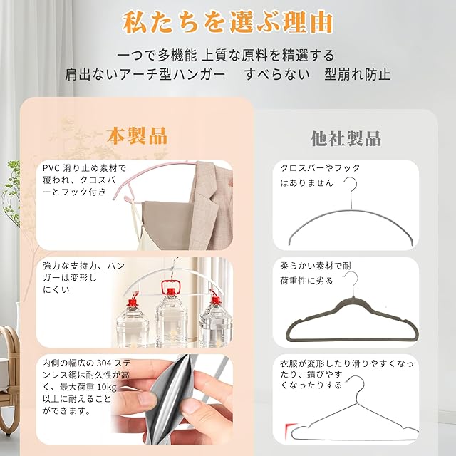 【アークタイプの跡がつ無しス設計】ハンガーは衣服を吊るした後、両側の突出部分を取り除くように、力学の原理により両側に円弧を配置して設計されています。丸みをおびた形が型崩れしやすいニットや薄手のトップスも美しくキープ!この形を採用することで、洋服の肩部分に掛かる力を分散し、部分的に過度な力が掛かるのを防いでくれるのです。型崩れしやすいセ―ター、ニット等にも対応しています。衣類の保管時だけでなく、洗濯後に乾燥させる際にもかたくずれの防止効果を発揮します。