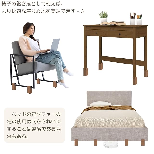 【継ぎ足しで高さ10CM上げる】家具脚を10cm上げられます。継ぎ脚より家具の高さを上げて、掃除ロボットやペットたちに移動する隙間を作り出し、テーブル 、ベッド、椅子、ソファー、食卓が低かったら物の収納スペースを最大限に活用できます。食卓やテーブルの高さを調節することによって、姿勢を正すことで腰にも優しいです。大きな開け幅により、テーブルだけでなく 、ソファー、ベッド、デスク、料理台、椅子、こたつ、ロッカーなど、あらゆる家具にも適用です。※斜め足の家具に適用しません。