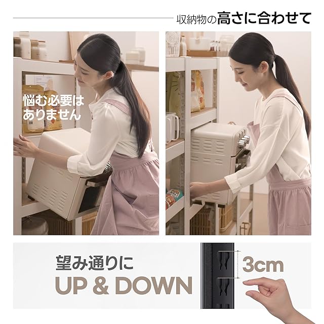 簡単な組み立て&高さ調整可能:ワイヤー棚のようにプラスチッククリップなどの部品は必要ありません。棚受を支柱穴に押して固定するだけです。一回の組立で多くのスペースを取らずに多くの追加収納スペースを作ることができます。棚の各段は柱の内部のシークレットホールに3cm間隔の溝があり、物の大きさに合わせて棚を上下に自由に調節でき、ご希望に合わせた収納スペースが作れます。