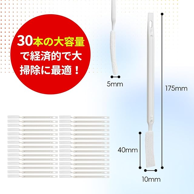 商品仕様:内容量:10本入り;サイズ:全長:17cm ブラシ部分:4cm×1cm×0.3cm。隙間ブラシは手が届かな狭い所に溜まった汚れ・カビ・埃の掃除に大活躍!手軽な隙間掃除グッズ!