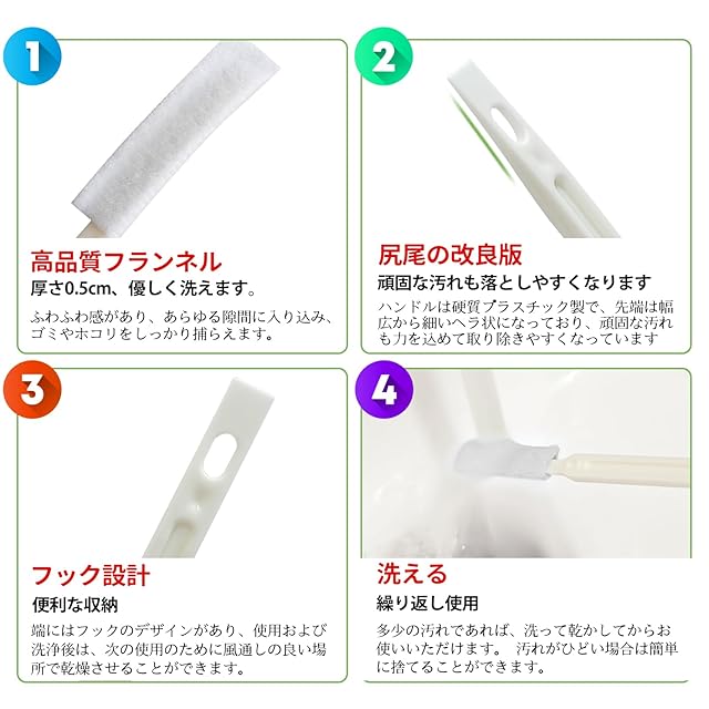 耐久性良い、洗って繰り返し使える:ブラシは上質なフランネル素材で作った、先端が少し反っていて、プラウチックの柄にしっかりと固定されています。丈夫な耐久性、隙間にしっかり入り込み、汚れても水洗いして何度でも使えます。