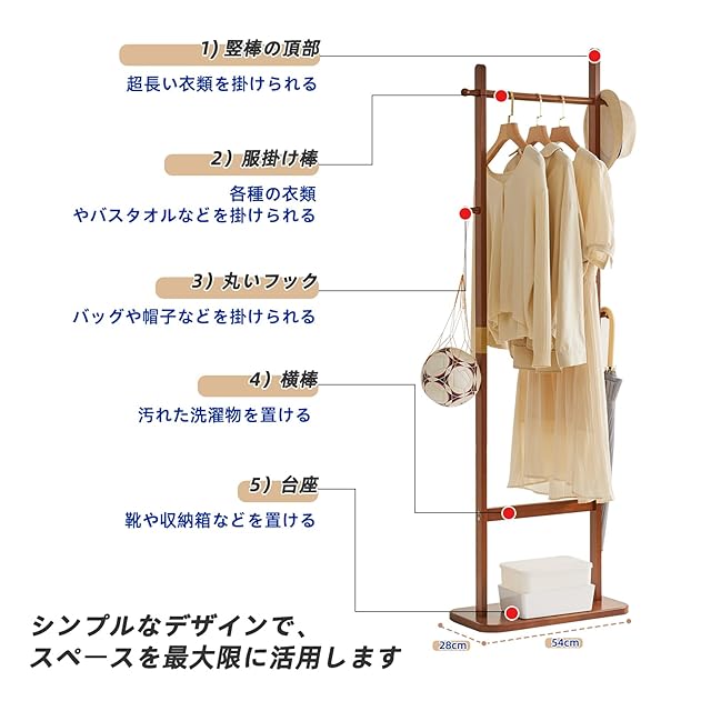 幅の狭いポールハンガーで省スペース: 幅54×奥行28×高さ180cmの寸法は、スリムなポールハンガーであり、玄関などの狭いスペースに置くのに適しています。