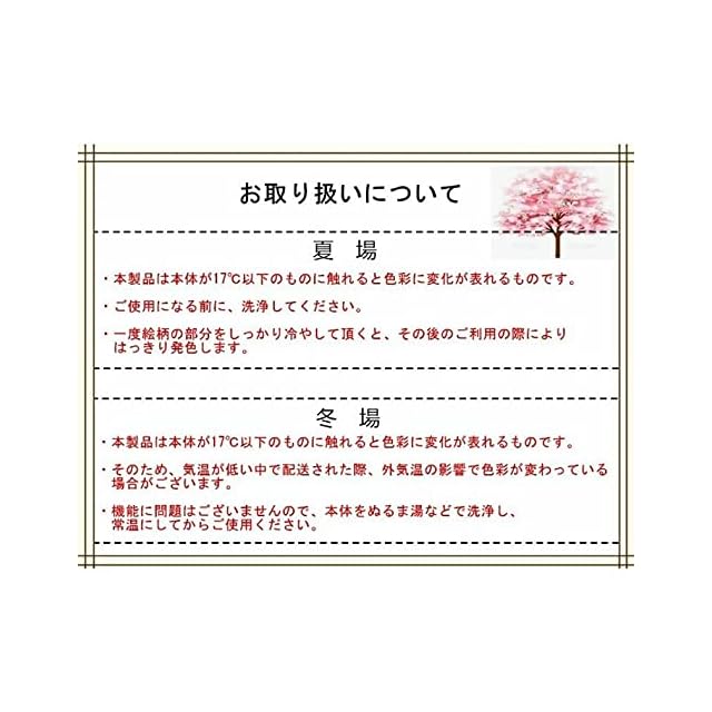 ・ご使用になる前に、洗浄してください。 ・食器洗浄機のご使用はお控えください。 ・台所用中性洗剤とスポンジ等の柔らかい素材で洗浄してください。 ・金属タワシや研磨剤等の硬い素材を用いて洗浄しないでください。 ・強く擦ると転写が剥がれてしまうことがあります。 ・電子レンジやオーブン等でのご使用はおやめください。 ・絵柄の染料は紫外線に弱いため、日光に長時間当てないでください。 ・水またはぬるま湯の中に長時間浸けないでください。 ・発色に関しては、個体差が生じることがあります。 ・手作業の為、転写の位置や形状が異なることがあります。 ・気温により箱から出した時に既に発色していることがあります。 ・冷感シリーズは一度絵柄の部分を冷やして頂くと、その後のご利用の際によりはっきり発色します。