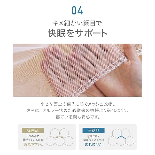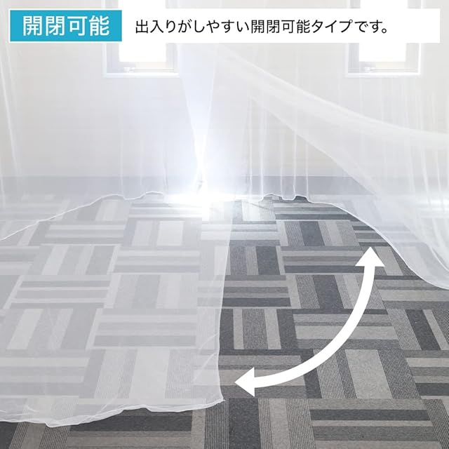 【虫の侵入をシャットアウトするモスキーネット】 細やかな目のネットは、小さな蚊1匹も通しません。 360°方向から蚊やハエなどの虫をガードできます。 開閉部付きの蚊帳は前後2箇所の出入り口付きです。