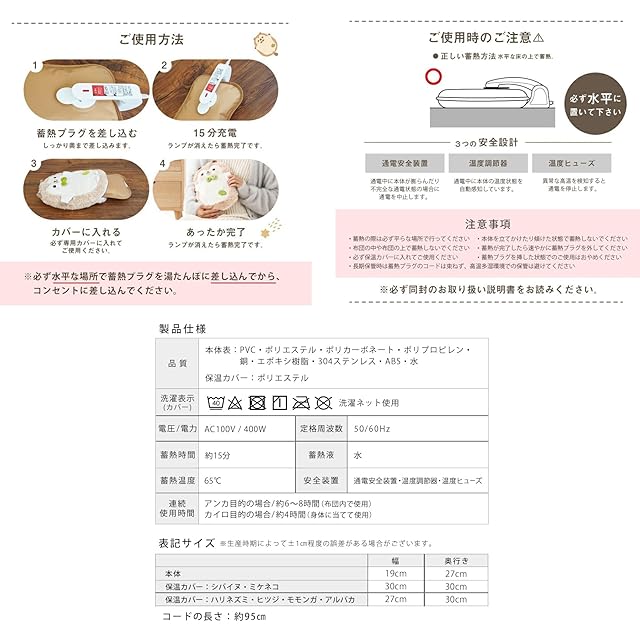 蓄熱1回あたりの電気代は約2円で家計にも優しい。体に当ててカイロとして使用した場合は約4時間、布団の中でアンカとして使用した場合は約6~8時間、あたたかさが持続します。