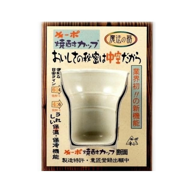 おいしさの秘密は中空だから<br><br> <キーポ焼酎カップの特徴><br><br> <保温・保冷> キーポ 焼酎カップは水割り・お湯割りに便利な 6:4 4:6 目安ラインがついています。<br> 魔法瓶のしくみを応用した二重(中空)構造の陶磁器(陶器)で “保温性” “保冷性” に優れ、冷たいものは結露しにくいのが特徴です。<br> 又、電子レンジ対応(金彩・銀彩除く)で、二重構造ですので外側まで熱が伝わりにくく、安心してお使いいただけます。<br> (温め過ぎにはご注意下さい)