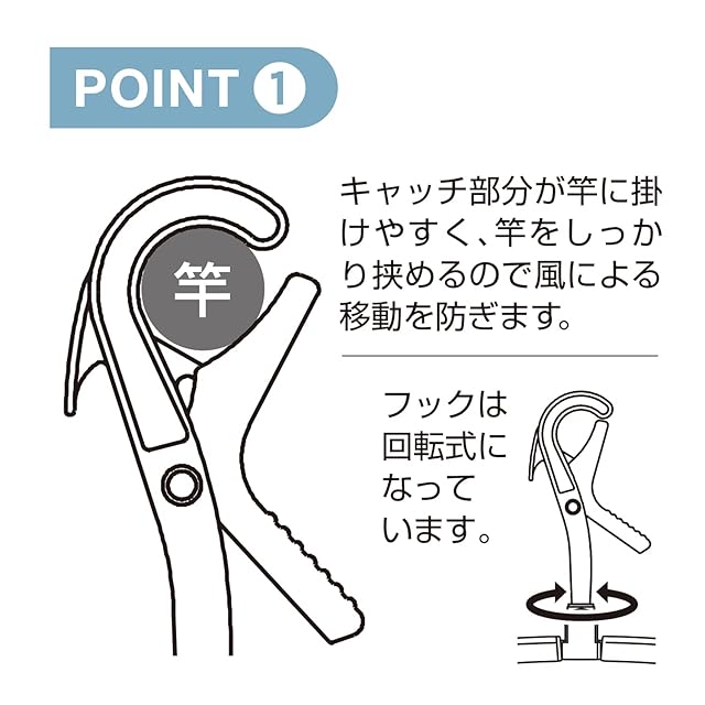 【キャッチ式でしっかり固定】竿にかける部分はしっかりしたキャッチ式。風でハンガーが移動したり飛ばされてしまうのを防ぎます。
