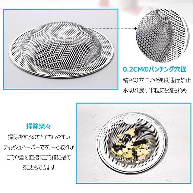 【精密なパンチング穴、使いやすい】高密度穴により、水切れがよく、髪の毛もしっかりつかまれます。ゴミや野菜くずも、簡単にキャッチできます。何時までも洗面所とシンクの排水口を清潔にキープしています。取り付けたらすぐ使えます!