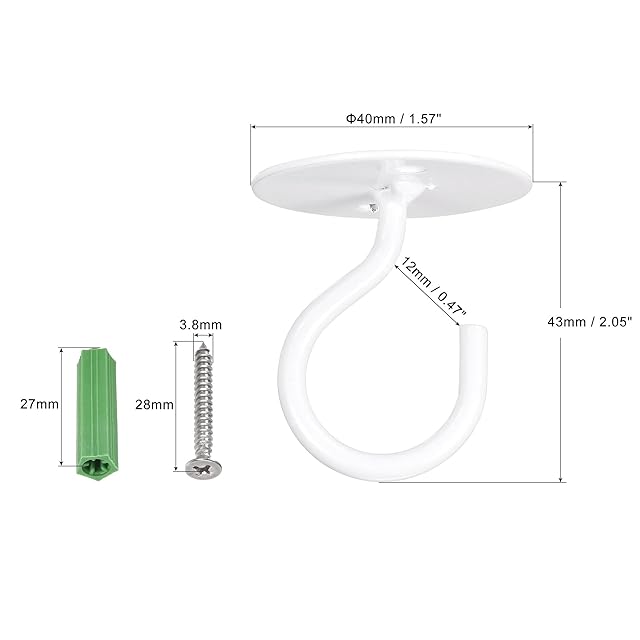 <br />これは何ですか?<br /><br />天井のフックはシャンデリア、植物、風鈴、ランタン、照明器具を家に吊るすのに適しています。天井、壁、柵、バルコニー、ドア、庭に取り付けることができます。<br /><br /><br />何がもらえますか?<br /><br />材質:鉄<br />仕上げ:ベーキングペインティング<br />カラー:ホワイト、グリーン<br />合計サイズ:40 mm x 43 mm(D * H)<br />フック開口幅:12 mm <br />取り付け穴の直径:4 mm <br />取り付け穴の距離:25 mm <br />ネジのサイズ:3.8x28 mm(D * H)ネジアンカーサイズ:7x27 mm(D*H)<br />パッケージの内容:2個x天井フック、4個xネジ、4個xネジアンカー<br /><br /><br />製品の利点はありますか?<br /><br />フックは鉄製で、耐荷重性が高く、耐久性があり頑丈です。迅速な設置に必要なハードウェアが付属しています。<br /><br /><br />それを使用する方法?<br /><br />壁にドリルで穴を開け、ネジアンカーを取り付け、フックを取り付けた後にネジを締めるだけです。<br /><br /><br />何に気付くべきですか?<br /><br />レンガ、木、コンクリートの壁に使用できます。8kg / 18lbsまでの最大負荷。