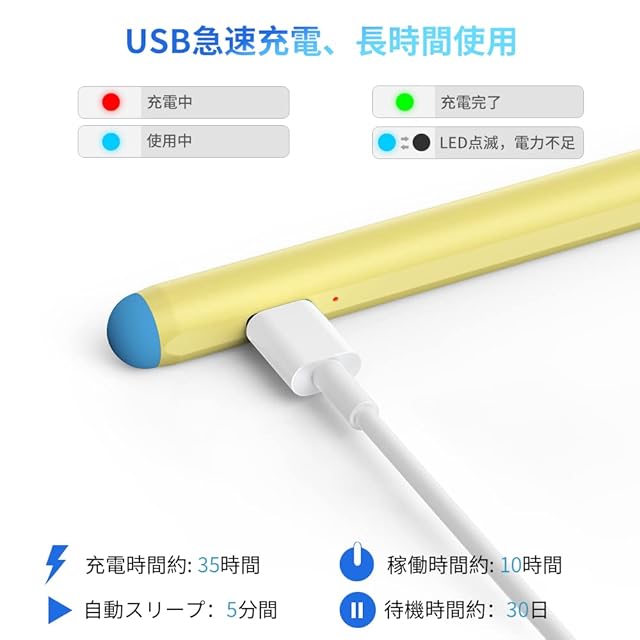 「USB-C充電式&長時間使用」JAMJAKEデジタルペンシルは、USB-C充電式タッチペンです。35分間フル充電で10時間継続使用可能となります。静止の状態で 、5分間放置すると自動スリープし、30分間 放置すると自動オフし、電源の切り忘れを 防止でき、バッテリーの節約に役立ちます。
