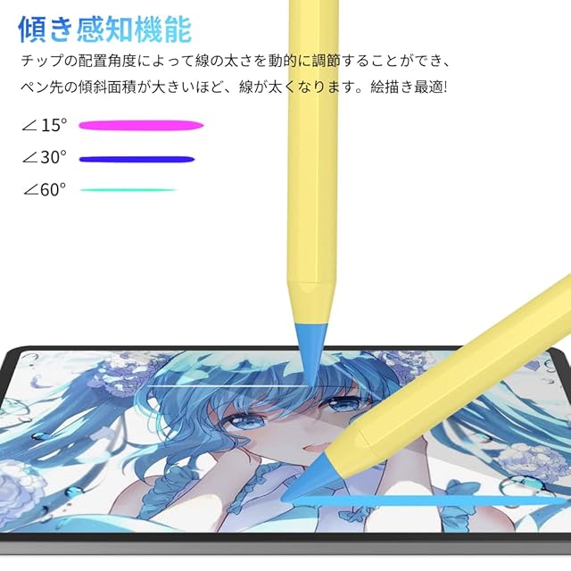「傾きを感知機能対応&使いやすさ」JAMJAKE iPad用タッチペンは、傾きを感知できるので、チップの配置角度によって線の太さを動的に調節することができ、絵描き最適! また、bluetoothで接続しなくても利用できる。面倒な設定は不要で、タッチペンの上部を軽くタップして電源をオン/オフにして、非常に簡単です。(ご注意:傾き感知機能対応ソフト:SketchBook、Procreate、Paper、Noteshelf )