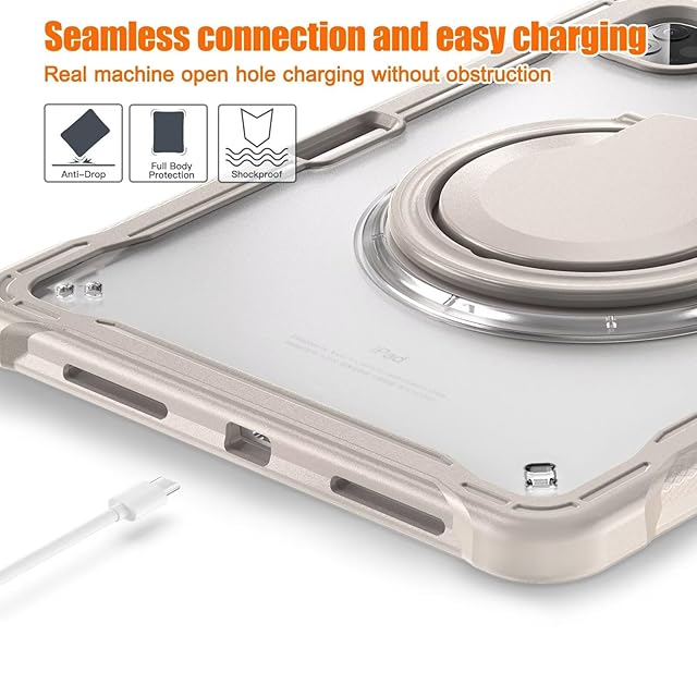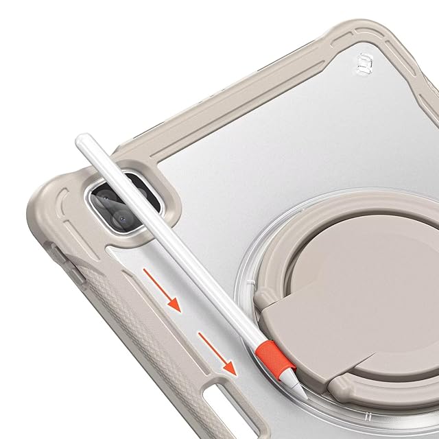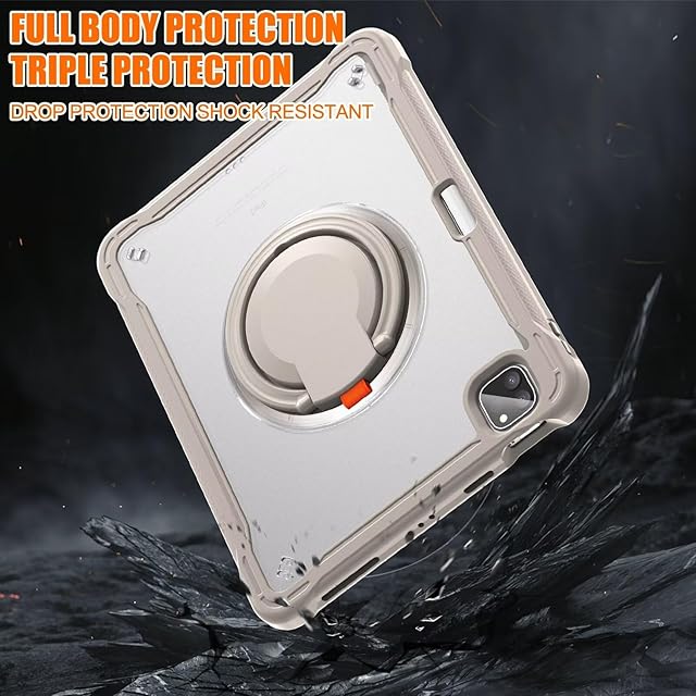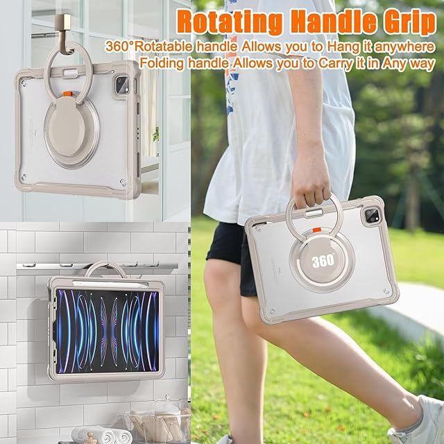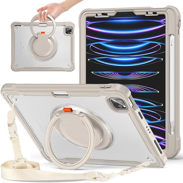 360°回転 iPad Air 13 2025/2024 (M3 M2) ケース 回転リング iPad Pro 12.9インチ 背面カバー 第6世代 5世代 4世代 3世代半透明ケース 肩掛け 調節可能 ショルダーストラップ付き 薄型 軽量 ペンホルダー付き,カーキ
