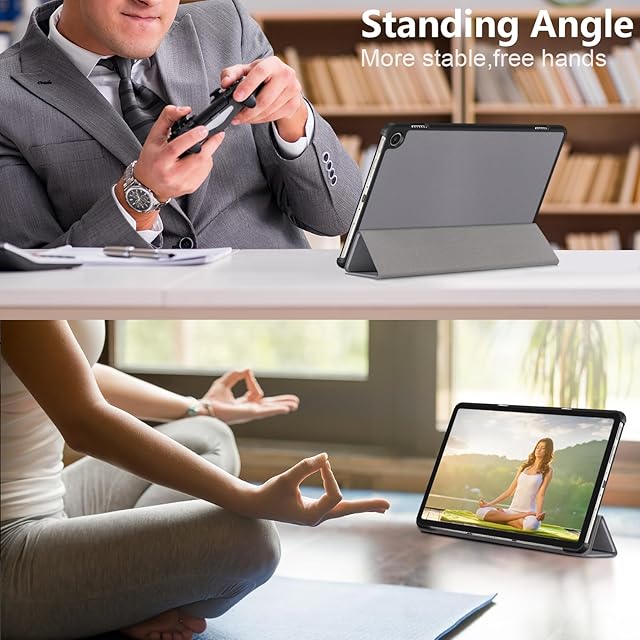 【三つ折りデザイン】:人間工学に基づいたスタンド角度で両手を解放されております。動画視聴(65°)とタイピング(30°)の2つのアングルで使えて、お好きな角度でタブレットを楽しむことができます。
