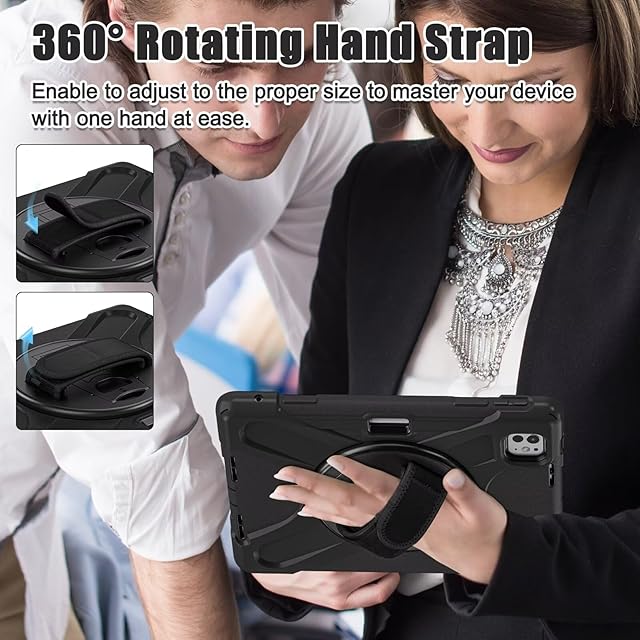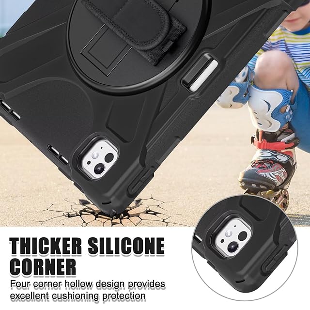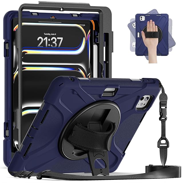 肩掛け iPad Air 13インチ2025 M3/2024 M2ケース 360度回転 ハンドストラップ ショルダーストラップ iPad Pro 12.9 第 6/ 5/ 4/ 3世代ケース 縦置き 横置き Apple pencil 收納 落下防止 キッズ 頑丈 シリコーンPC,ネイビー